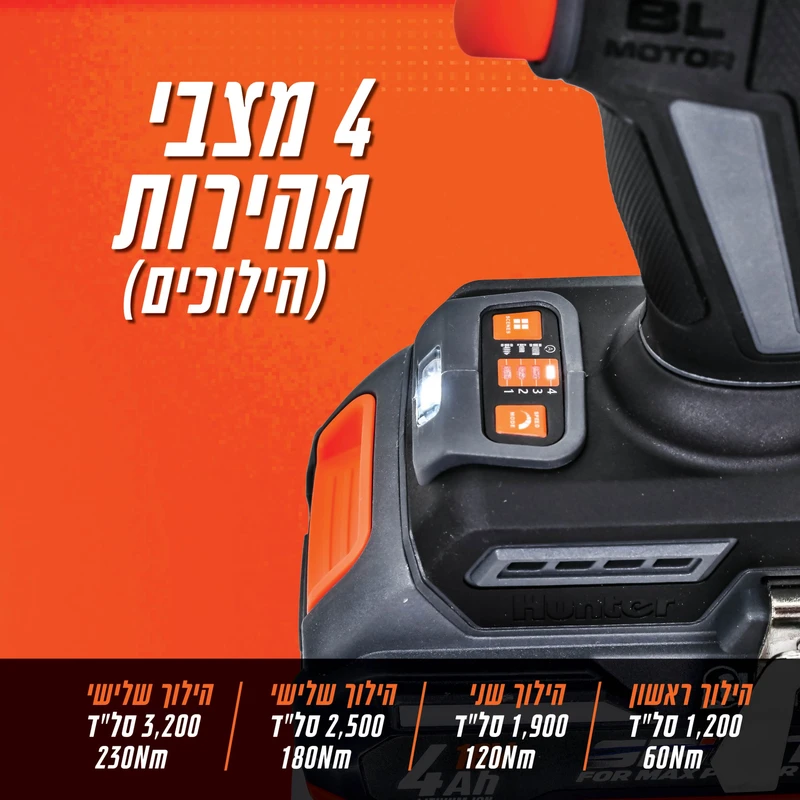 - 3 מצבי עבודה מתקדמים - מצב הברגה רגיל, מצב אימפקט למשימות קשות ומצב מיוחד לעבודות דיוק. בשילוב עם 4000 מכות לדקה, מקבלים ביצועים שאין שני להם בקטגוריה.