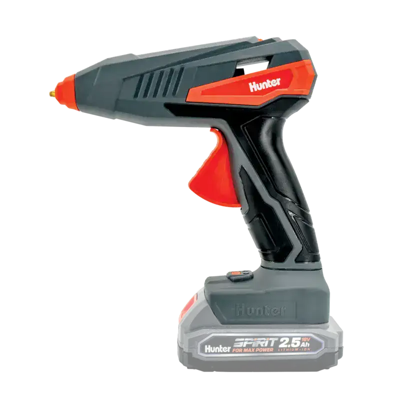 אקדח דבק חם נטען 18V בהספק 100W מבית Hunter. אקדח דבק עוצמתי ונייד המתאים לביצוע מגוון עבודות הדבקה ללא סרבול של כבלים ומיועד לשימוש של טכנאים, חשמלאים, מתקינים וגם אנשי DIY וחובבי מלאכת יד.