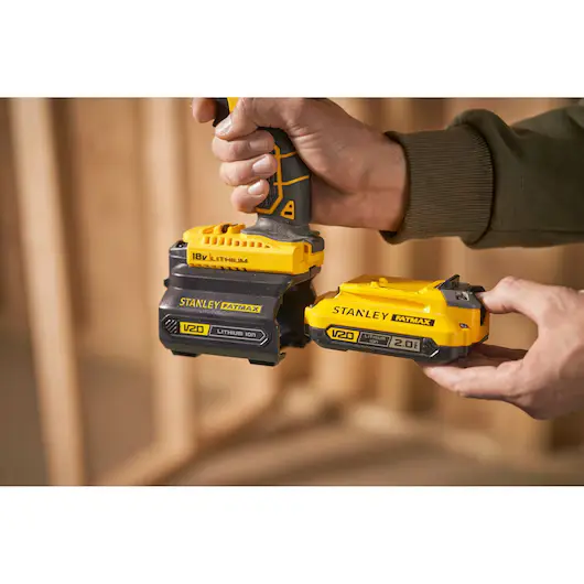 מתאים לסוללות V20 18 V (1.5 Ah / 2.0 Ah) – מאפשר להשתמש בסוללות החדשות של מערכת V20 עם כלי הדור הקודם של סטנלי