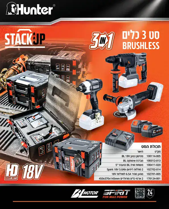 | נתוני הסט: | סט 3 כלים נטענים 18V BL עם זוג סוללות 5Ah ומטען מהיר | Hunter |