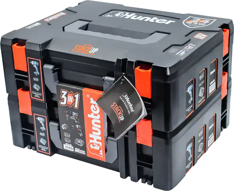 | הסט מכיל שלושה כלים נטענים 18V מבית Hunter - פטישון, אימפקט ומשחזת. הכלים אידיאליים לעבודות בית, שיפוץ, DIY, השחזות וקידוחים בבטון, ומתאימים לכל בעל מקצוע. | מערכת האחסון המודולרית כוללת 2 ארגזים הניתנים לעירום, עם הקצפה קשיחה פנימית המגנה על הכלים. המערכת מאפשרת אחסון מסודר וקומפקטי של כל שלושת הכלים. |