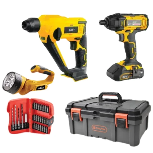 סט 2 כלים מבית מותג כלי העבודה GPT אשר מורכב מ אימפקט ופטישון + סוללה 2HA ומטען .