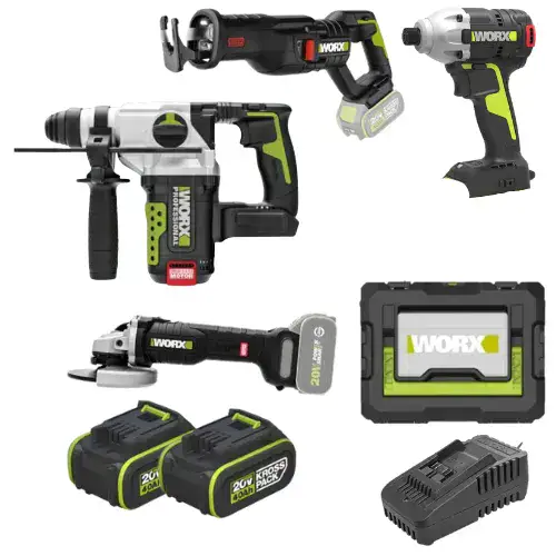 המכיל 4 כלים מבית WORX כולל 2 סוללות 4HA מטען WORX