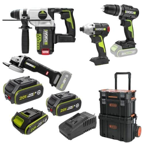 4 כלים | סוללה 2Ah + שתי סוללות 4Ah ומטען וארגז | WORX 20V