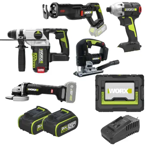 המכיל 5 כלים מבית WORX כולל 2 סוללות 4HA מטען WORX