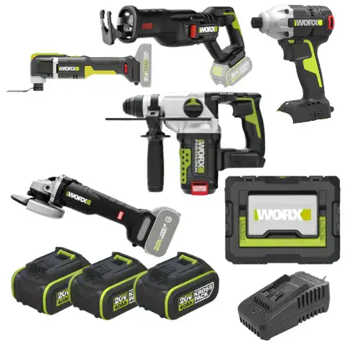 המכיל 5 כלים מבית WORX כולל 3 סוללות 4HA מטען WORX