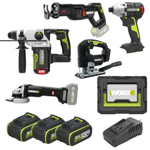 המכיל 5 כלים מבית WORX כולל 3 סוללות 4HA מטען WORX