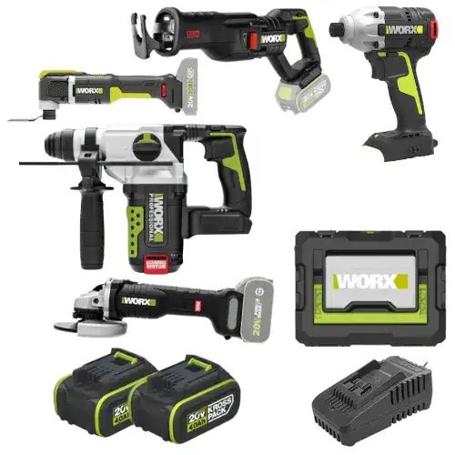 המכיל 5 כלים מבית WORX כולל 2 סוללות 4HA מטען WORX