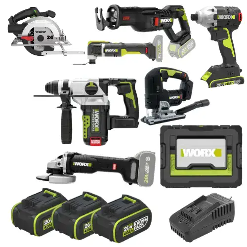 המכיל 7 כלים מבית WORX כולל 3 סוללות 4HA מטען WORX