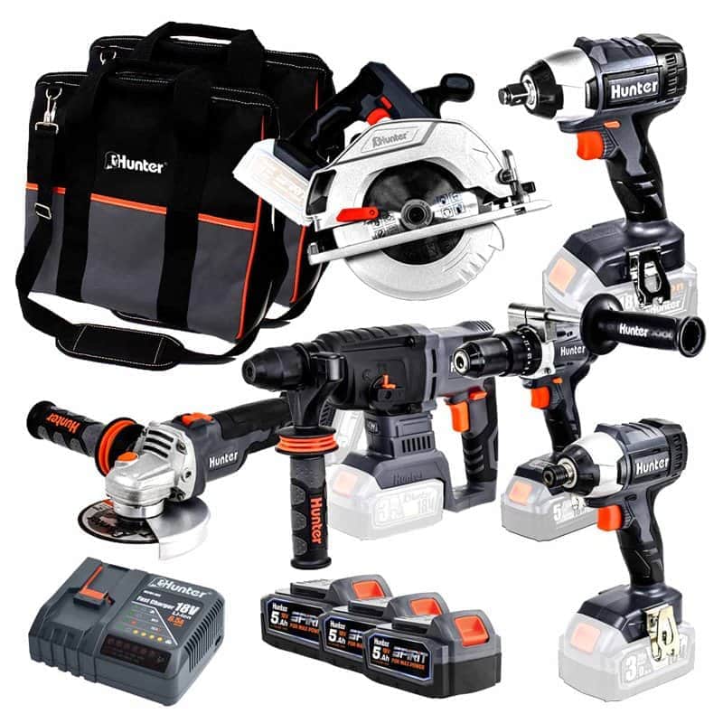 | נתוני הסט: | סט 6 כלים נטענים BrushLess | פטישון | מברגת אימפקט | מפתח אימפקט |מברגה רוטטת קודחת | משחזת זווית | מסור עגול | 2 תיקי בד ייעודי בסיס קשיח | 5AhX3 | מטען מהיר Hunter | 6.5A |
